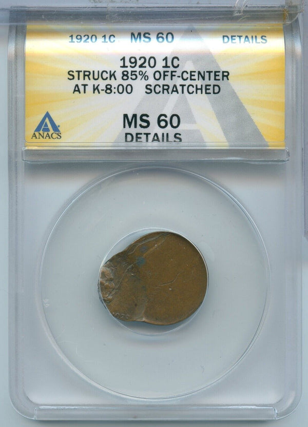 1920-P Lincoln Wheat Cent Error Struck 85% Off Center ANACS MS60 Penny