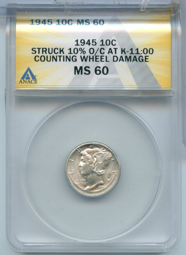 1945-P Mercury Silver Dime Error Struck 10% Off Center ANACS MS60 Dime